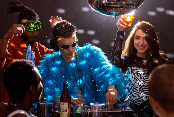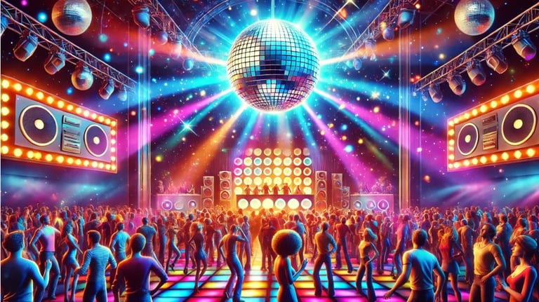Incluye: Decoración pequeña, Prestada, discos al techo, apliques 80s en paredes, Marco para toma de fotos .